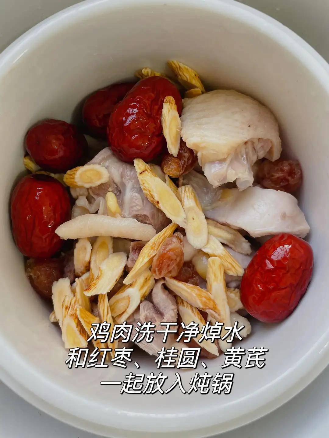 鸡斩块,冷水下锅焯水,煮出浮沫后捞出来,用温水冲洗干净。黄芪用清水稍微冲洗一下,红枣去核。