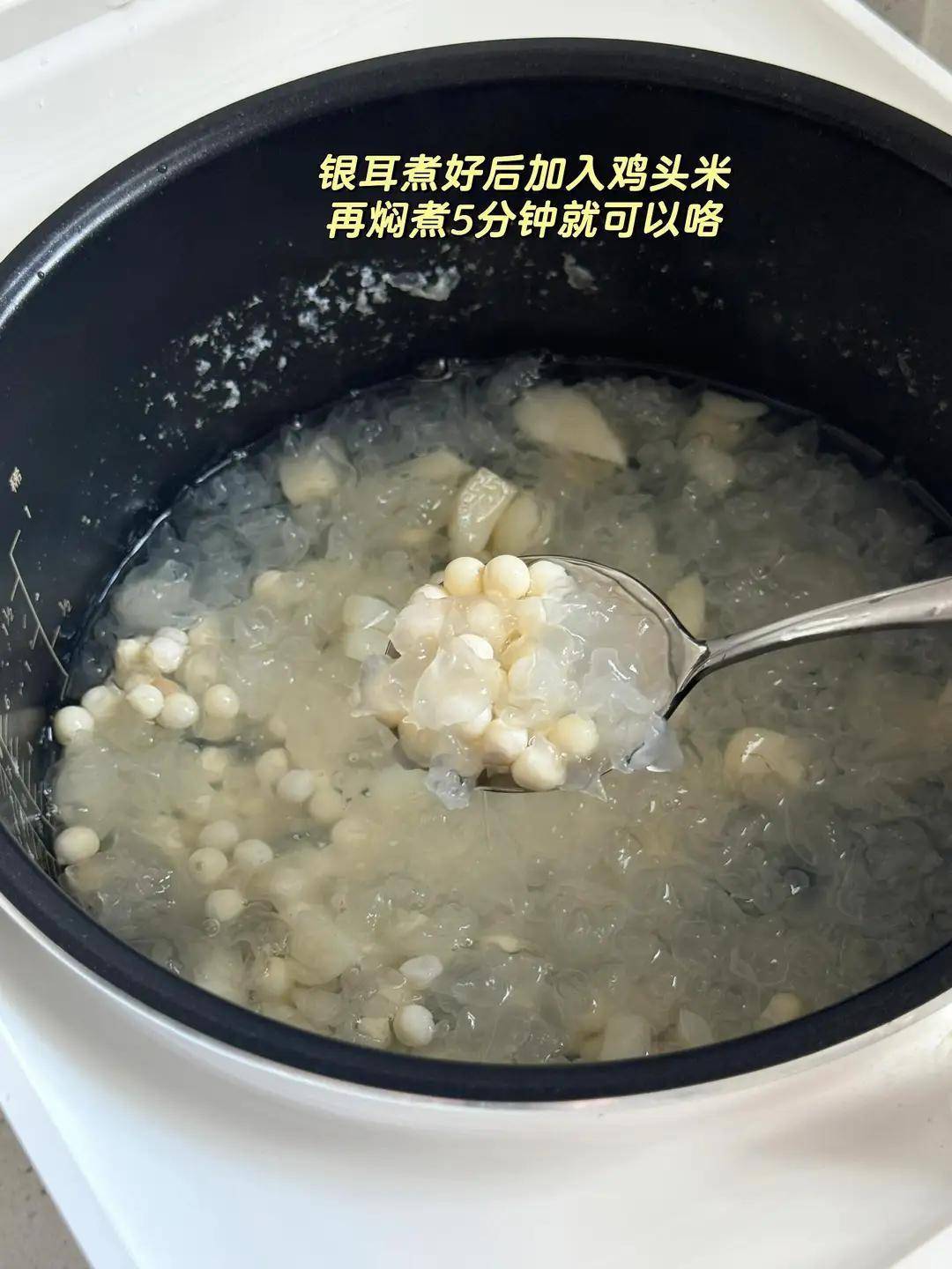 锅里加足量清水,先放银耳,大火煮开后转小火炖半小时,看到银耳变软、汤汁有点黏稠了,再放鸡头米和马蹄,继续炖二十分钟。最后加冰糖,搅匀化开就关火。