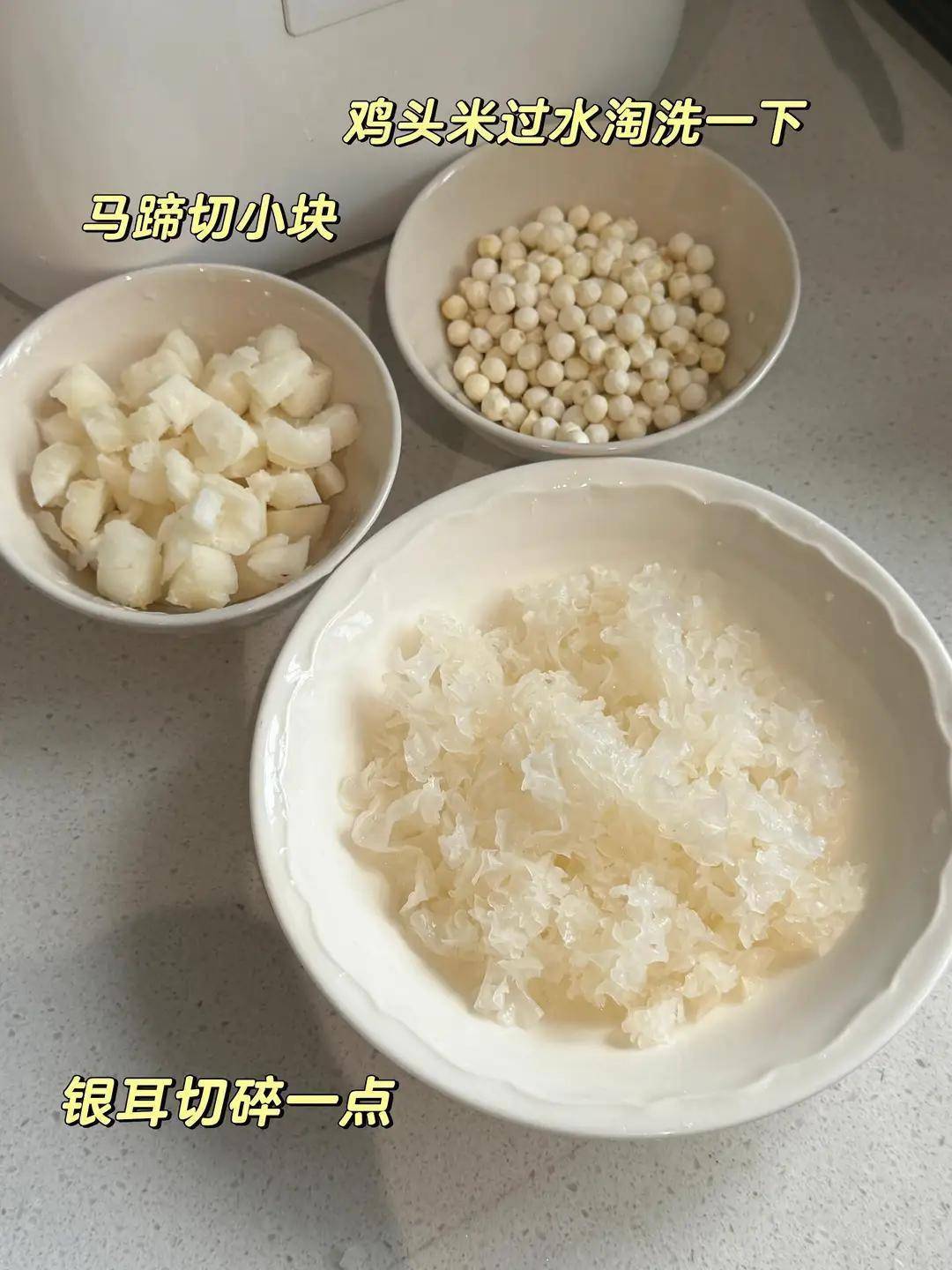 食材:新鲜鸡头米一小碗(干的也行,提前泡发)、银耳半朵、马蹄五六个、冰糖适量。