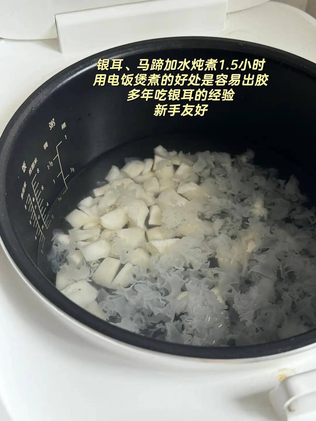 银耳提前用冷水泡发,撕成小朵,越碎越容易出胶。马蹄削皮切小块。如果用的是干鸡头米,提前泡两小时。
