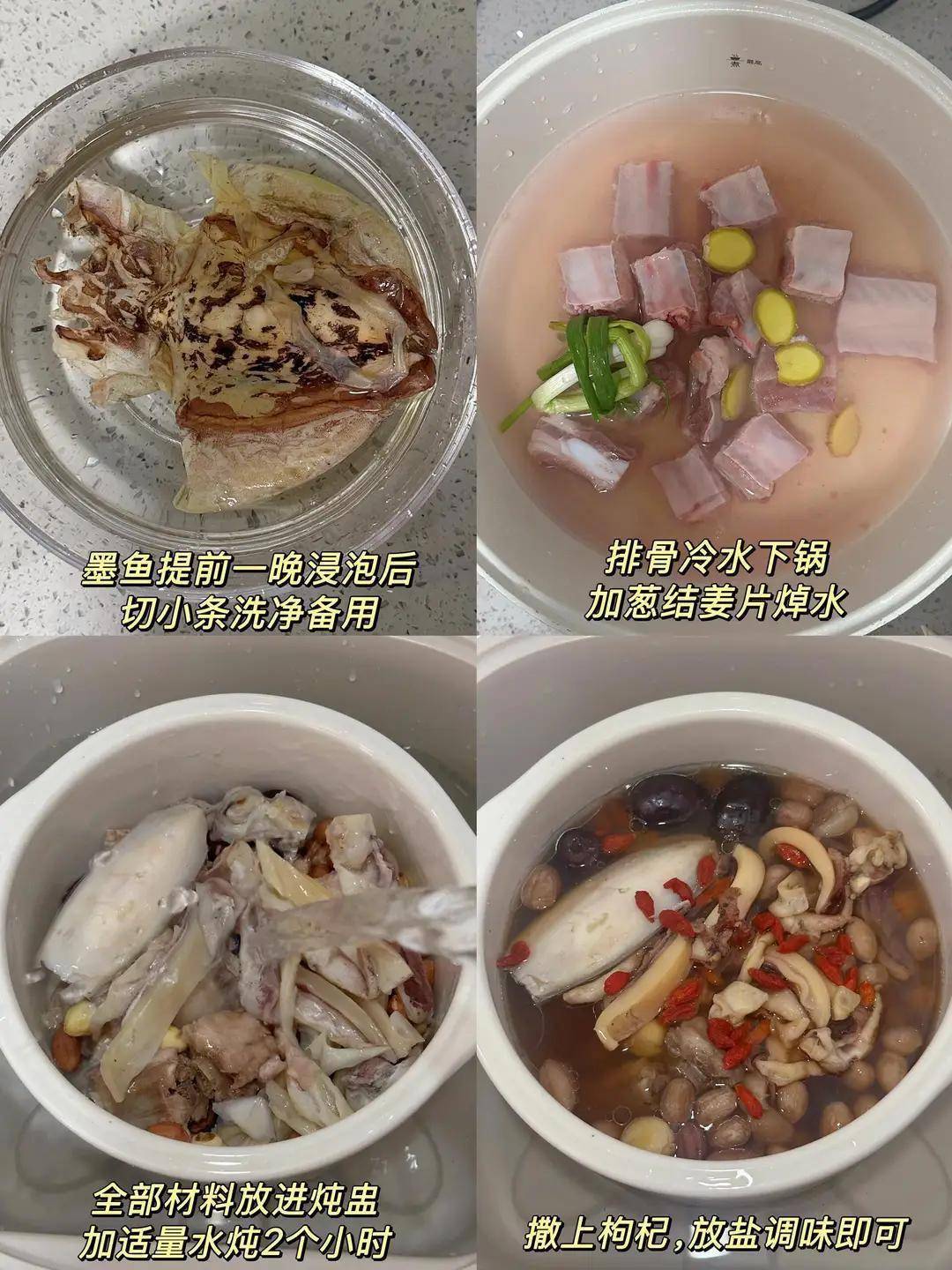 锅里放足量清水,把墨鱼、排骨、姜片、红枣一起放进去,大火烧开后转小火,慢炖一个半小时。炖到汤色奶白、墨鱼软烂,加盐调味就行。