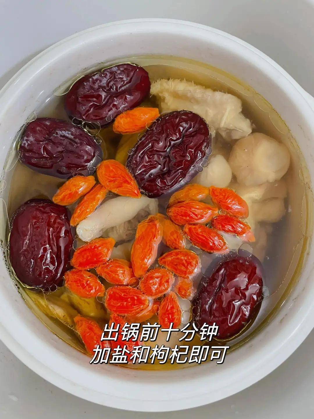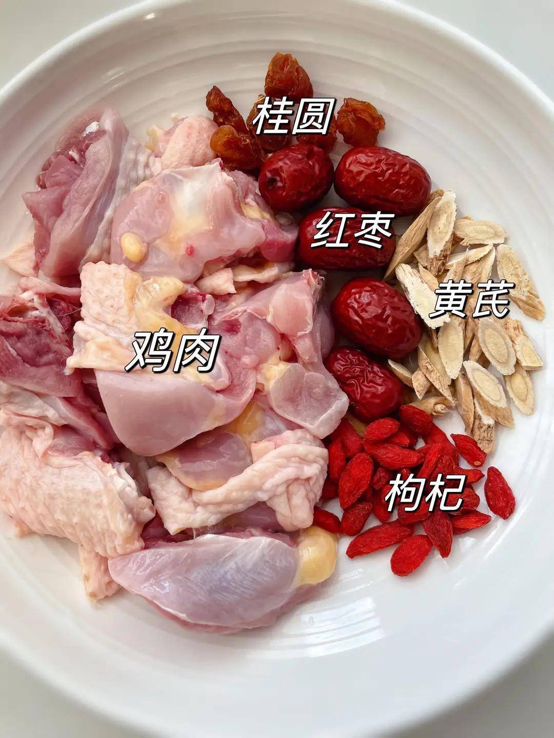 食材:老母鸡半只、黄芪一小把(约二十克)、红枣十来颗、生姜三四片、枸杞一小撮、盐。